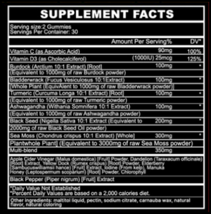 Wildcrafted Sea Moss, Burdock Root, Turmeric, Ashwagandha, Black Seed Oil, Dandelion, Elderberry, Vitamin D3, Vitamin C, Chlorophyll, Manuka Honey, Apple Cider Vinegar, Yellow Dock, Black Pepper, Bladderwrack, Apple Pectin